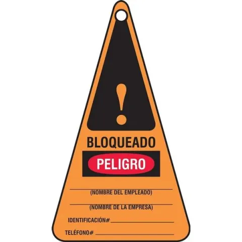 Identify locked out items in your workplace to prevent serious dangers. Unique triangle-shaped safety tag quickly warns others Prevent electrical-related injuries from an accidental start-up Tag has one self-laminating flap on front side Traditional OSHA-style signs, tags and labels are the most widely recognized design format in the industry Danger header indicates a hazardous situation that, if not avoided, will result in death or serious injury Pulp-free - no wood pulp or paper content - will not rip or break down in moisture Pliable, polyolefin-based material, with 3/8" hole Ideal for indoor use and short-term outdoor exposure Scuff-resistant, matte surface is easy to write on Can be printed on both sides, perforated, sequentially numbered, and barcoded Size: 7" x 4" Unit of Measure: 25/Pack Material: PF-Cardstock Language: Spanish