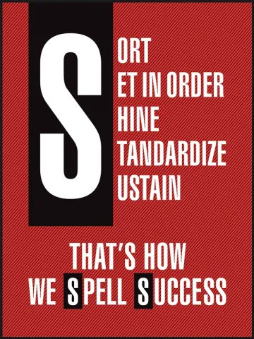 Clearly and succinctly display the 5S principles Strengthen the 5S methodology within your facility Post on walls in key locations to provide a daily visual reminder Support and spread the program message Printed in bold, eye-catching colors Optional laminate creates durable, flexible plastic protectionProduct Description