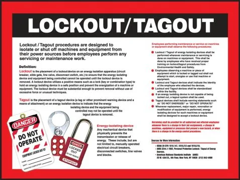 A comprehensive poster reviewing many aspects of lockout/tagout programs.