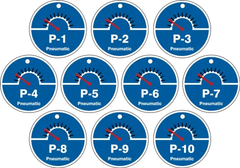 Use Energy Source Identification Tags as part of a comprehensive Lockout procedure to comply with OSHA 1910.147(C)(4). Series numbered tags support machines with multiple energy sources. Tags measure 2 1/2" with 3/16" hole. Vibrant colors, bold graphics and unique shapes are ideal for machine-specific procedures that can be easily and quickly identified.