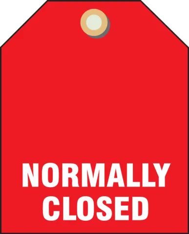 Prevent accidental adjustment of valves throughout a facility by indicating status Normally Closed legend is contrasting white on black 15-mil RV-Plastic tag 2 1/2-in high x 2-in wide with 3/8-in metal grommet Package of 5Product Description