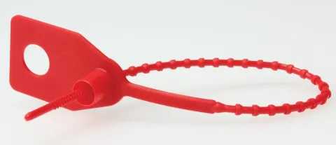 Loop and pull to lock - easy to use, no-nonsense, plain red, single-use plastic seal.