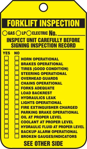 Post this inspection tag to list the many parts of the forklift that work properly.