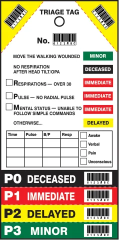 First responders in mass casualty incidents need to quickly prioritize injured victims. Write in information and tear along the perforations to the proper injury level. Tags have readable sequential numbering with accompanying Code 39 bar code in multiple locations to allow for accurate matching, identification, and person count. Tear-off identity corners are supplied to mark the accident location once the victim has been moved, and to label any collected personal belongings. 8" x 4" tag is printed on waterproof, weather-resistant PF-Cardstock with random start sequential numbering.