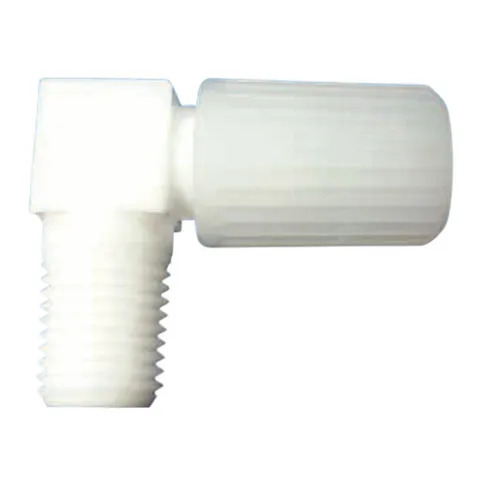 PTFE Tube Compression Elbow to Male NPT. Body and ferrules made of virgin PTFE. The nut and gripper are made of PVDF.