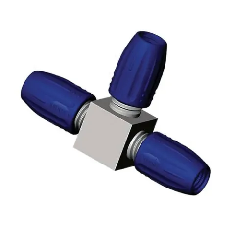 Three-way tubing connector Valve for applications where stream switching, reagent switching, sample removal or sample injection is desi-rable. Body machined of single-piece PTFE. Tefzel valves are rated to 500psi and have one moving part per channel for long life and trouble free operation. 1.5mm I.D. channels meet at Valve center. Zero dead space within Valve. Polypropylene caps with Fluoron elastomer O-Ring seals, for instant connection of rigid or flexible tubing (0.5 to 4mm O.D.). 1/4"-28 thread at back of caps. Autoclavable.