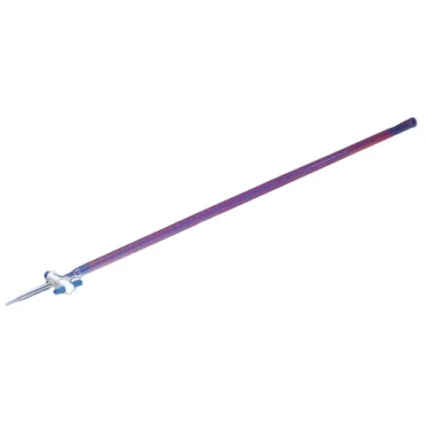 These burets are suitable for use in school and institutional laboratories not requiring the accuracy of Class A models. Supplied with a Product Standard Polytetrafluorethylene (PTFE) stopcock plug to reduce freezing and eliminate lubricant contamination. The microfinish of the barrel provides a precision fit. The tips are carefully drawn for accuracy to insure proper drainage rate. Each buret is supplied with a dust cover and has a permanently colored scale All sizes furnished with a 2 mm bore stopcock plug