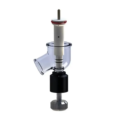 Flush seal bottom drain valve assembly, complete with glass valve and PEEK (polyetheretherketone) pinned PTFE valve stem for stir shaft stability when shaft is equipped with 8100 or 8101 PTFE agitators, Kalrez® o-rings for superior chemical resistance from -15 to 230 degrees C. Fits 3 inch beaded pipe reaction vessels and features a 2 inch beaded pipe outlet.