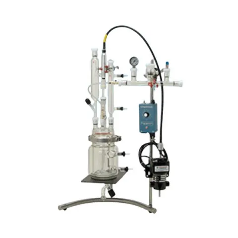 The reactor is the two-piece System, with a maximum pressure limit of 35 psig at 100°C. The Two-Piece System consists of a flanged flask and head with a shallow O-Ring groove, O-Ring, and quick-release clamp. Flange size is 150 mm inside diameter, allowing the use of large agitators and facilitating product removal and clean-out.