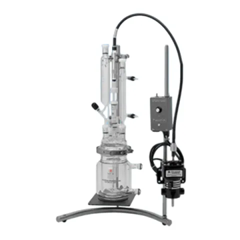 1L jacketed general purpose bench top reactor system supplied complete with everything necessary for operation. The system is designed so that all wetted surfaces are glass and PTFE for maximum chemical compatibility. A small overall stand footprint and flexible drive shaft combination allow for the reactor system to be placed in almost any laboratory hood configuration.