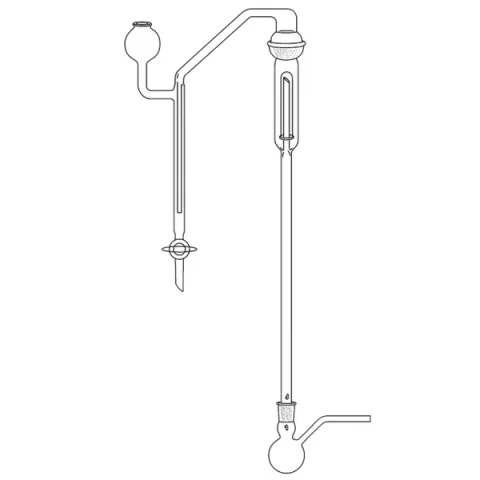 Used for methoxy determination as described in U.S. Pharmacopeia, 1995, page 1742. Complete consists of 20 mL boiling flask with 14/20 joint and a capillary side arm, scrubber trap column with 14/20 inner and 35/20 socket, and an absorption tube with 35/20 ball joint and a 2mm bore glass stopcock. Flask and column supplied with hooks for spring connection