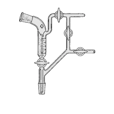 An excellent all-purpose receiver for general distillation work. Equipped with a complete stopcock manifold to allow contents of the receiver to be removed to a single receiving flask without disturbing the vacuum of the system. Stopcocks are 4 mm bore. Tubing connections are 10 mm O.D. olive type. Graduated body.