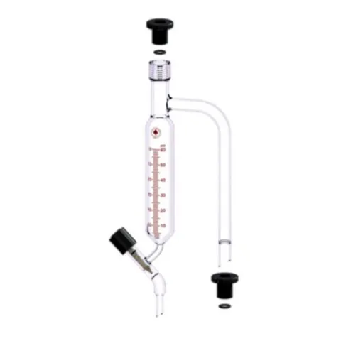 Moisture test receiver utilizes Ace-Thred bushings to achieve a 45psi at 100 degrees C pressure rating when used in conjunction with Ace pressure reactors. Graduated receiver in 1ml subdivisions with PTFE bottom outlet stopcock.