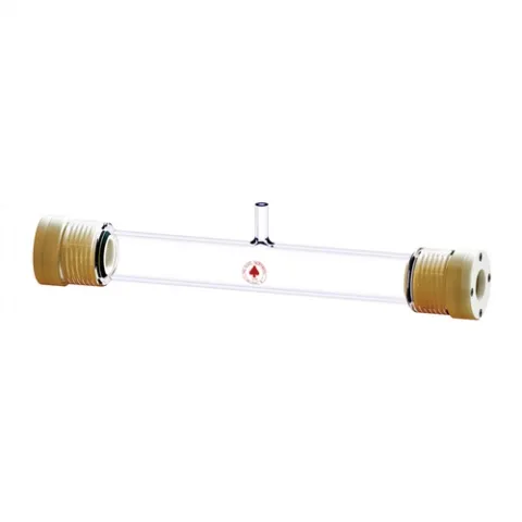 Straight, borosilicate glass, photochemical cell with threaded end fittings for use with 7896 cell window holder. The ease in removing these holders makes cleaning the cell easier. Comes with single plain port.