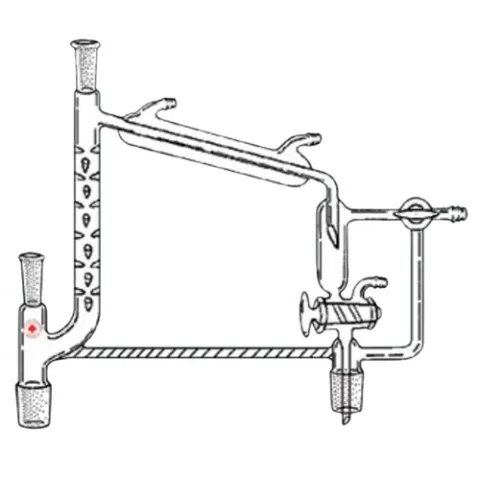 A compact fractionation unit for distilling small quantities in a vacuum, and for ordinary separation. The indents are positioned to cause the vapor to follow a spiral path, adding to the efficiency of the unit. By use of the three-way stopcock, a manifold arrangement is achieved, making it possible to remove receivers without disturbing the equilibrium of the system. 10/30 joint at top is for 25 mm immersion thermometer. All other joints are 14/20. Stopcocks are 2 mm bore. Hose connections on still are size A.