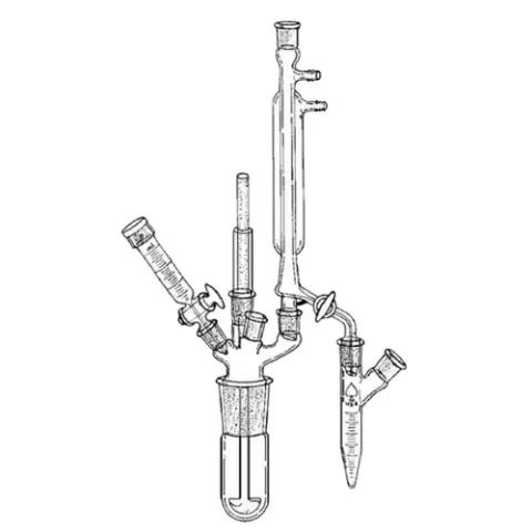 The flask is fabricated with an ACE 45/50 joint. Head has three 14/20 outer joints surrounding the 19/38 center opening. 8038 Trubore bearing. The agitator is a solid shaft with the blades shaped in the form of a half propeller. Rounded blades permit close tolerance with the flask bottom. The shaft is inserted in the bearing from underneath; design of the agitator is limited only by joint dimensions. The analytical still head with stopcock serves as a reflux condenser.