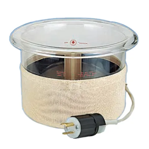 Large version bath that can accept round bottom flask up to 5L and other larger vessels. Bath measures 290mm (11.4 inches) I.D. by 235mm (9.3 inches) deep. The bath has a rolled lip for easy handling. The maximum temperature on this bath is 100°C. The full capacity is 15L without a vessel, and typically should have a minimum of six liters when using a vessel like a 5L round bottom flask. Baths must be run with a heating media or oil. Three-pronged plug for insertion into Ace temperature controllers. Integral six-foot controller cord.