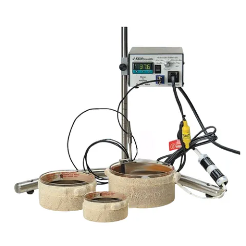 Low form glass vessels heated by Instatherm® similar to 9601's, except these have a permanently attached 12' PTFE covered power cord with 2-prong plug for direct insertion into the appropriate voltage controller. Power cord is integral to the bath for extra safety, avoiding a possible hazardous situation. Never operate dry; be certain that heat exchange medium is in bath before applying current.