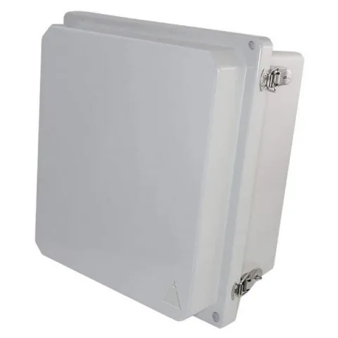 This rugged JIC style NEMA box is molded from durable UV stable and corrosion resistant fiberglass reinforced polyester (FRP) with a UL94-5V flame rating. The FRP material is dent-proof, non-conductive and RF transparent for compatibility with wireless equipment. It can be easily drilled and modified by the installer as needed. It features a gasketed door with stainless steel continuous hinge and stainless steel quick release latches with padlock hasps. The generous size of this enclosure and the extended lid accommodate a wide range of equipment.