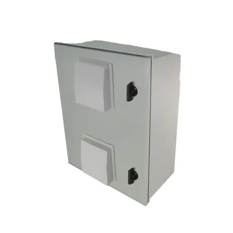 This configuration consists of the fiberglass NEMA enclosure with hinged lid and a equipment mounting plate with two pre-wired 120VAC power outlets. The outlet box is easily removable to facilitate wiring to an external power source.
