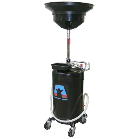 Self-Evacuating "Pumpless" Waste Oil Drain Uses standard shop air set at 8 PSI to evacuate the drain into a waste oil holding tank. 24-gallon steel tank for use with used oils. Safety pop-off valve prevents over pressurization. Includes removable storage tray, built-in fluid gauge, 7' discharge hose with curved nozzle and manual shut-off valve, articulating 15-3/4" diameter metal drain bowl (TIM-317-37C) with oil filter draining screen and 24" removable plastic drain bowl expansion funnel (TIM-317-39). Stem adjusts 51" to 78". Powder-coated black paint