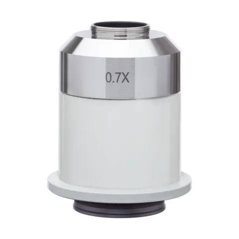 This is a 0.7X C-mount lens for Nikon microscopes, made of stainless steel and high-grade optical glass. The lens adapts C-mount cameras with sensors in the 2/3" to 1" range, to Nikon's E100, E200, 50i, 55i, 80i, 90i, Ni series, Ti series, SMZ800, SMZ1000, and SMZ15000 microscopes.