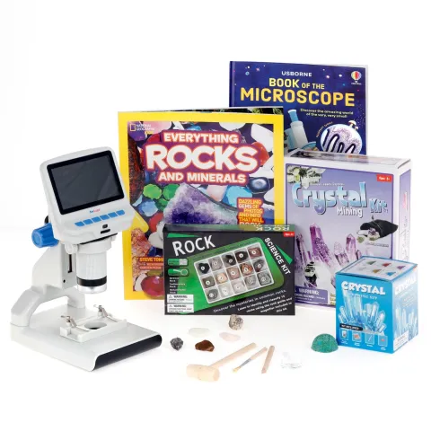 - This discoverer set includes a premium digital microscope with 4.3" LCD screen, crystal and gemstone dig kit, grow your own crystal kit, Everything about Rocks and Minerals book by National Geographic Kids