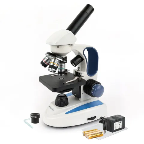 This high power microscope has incident and transmitted illumination. Designed for students to learn science, it comes with full optical glass elements, metal framework, 360 degree rotatable monocular head, coarse & fine focusing, and top & bottom LED lights that use either an outlet (adapter included) or three AA batteries (or re-chargeable batteries). It can view transparent biological slides and/or opaque objects like stamps and coins. It offers five magnification settings, 40X, 100X, 250X, 400X, and 1000X. This is an ideal microscope for academics in home school and from students in elementary to high school. A microscope of this caliber is an excellent instrument for hobbyists.