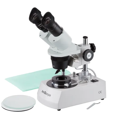 This binocular stereo microscope is designed mainly for jewelers, and comes with a darkfield stage-plate for viewing inclusions, and a gem clamp for holding gems and other objects to be viewed. It also features two pairs of stereo objective lenses mounted in a rotating nosecone, a sturdy all-metal pillar stand, and a versatile illumination system that provides both incident (top) lighting and transmitted (bottom) lighting. You can choose between incident illumination shining down onto the object or transmitted illumination through the frosted stage plate. The first is used for the observation of three-dimensional objects and the second for the observation of slides. This microscope offers high resolution and good depth within a broad field of view. It gives sharp clear stereo images. Its 45 degree inclined binocular head ensures an easy observation and rubber eye-guards provide further comfort.