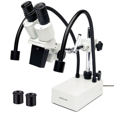 AmScope SE420 Series Compact Fixed-Lens Binocular Stereo Microscope 20X-40X Magnification on Boom-Arm Stand with Dual Gooseneck LED Lights