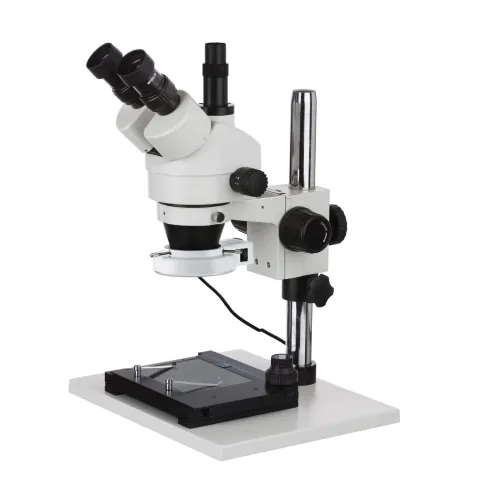 This is a trinocular stereo zoom microscope with a pillar-stand with extra-large base. It incorporates all the most excellent features of a high quality laboratory instrument. Designed to meet the demands of modern microscopy applications, this scope exceeds all expectations. It comes with SUPER widefield optics and super large stand. This microscope offers high resolution and good depth within a broad field of view. It provides crystal clear sharp stereo images with a 4" (100mm) native working distance. Its 45 degree inclined ocular tubes ensure an easy observation and rubber eyeguards provide further comfort.