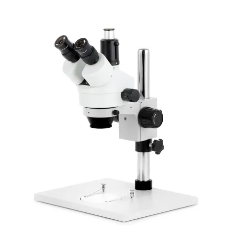 This is a trinocular stereo zoom microscope with a pillar-stand with extra-large base. It incorporates all the most excellent features of a high quality laboratory instrument. Designed to meet the demands of modern microscopy applications, this scope exceeds all expectations. It comes with SUPER widefield optics and super large stand. This microscope offers high resolution and good depth within a broad field of view. It provides crystal clear sharp stereo images with a 4" (100mm) native working distance. Its 45 degree inclined ocular tubes ensure an easy observation and rubber eyeguards provide further comfort.