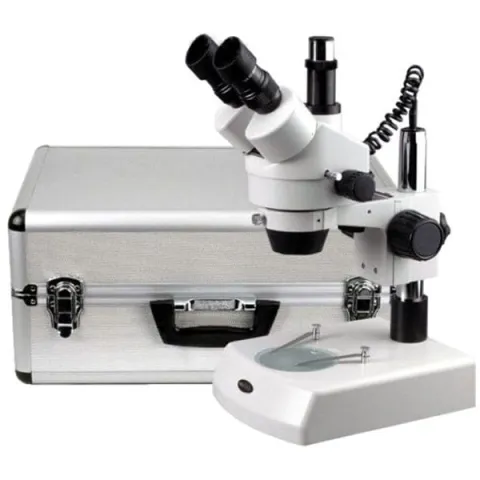AmScope SM-2 Series Zoom Trinocular Stereo Microscope 7X-45X Magnification on Pillar Stand with Aluminum Carrying & Storing Case