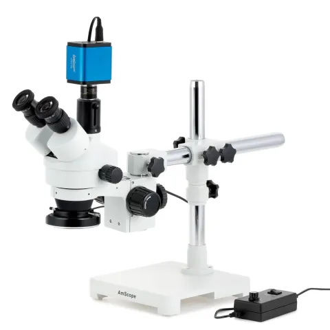 AmScope SM-3TZ-144-HD2 SM-3 Series Zoom Trinocular Stereo Microscope 3.5X-90X Magnification w/ 144 LED Ring Light and 2MP HDMI CMOS C-Mount Camera on Single Arm Boom Stand