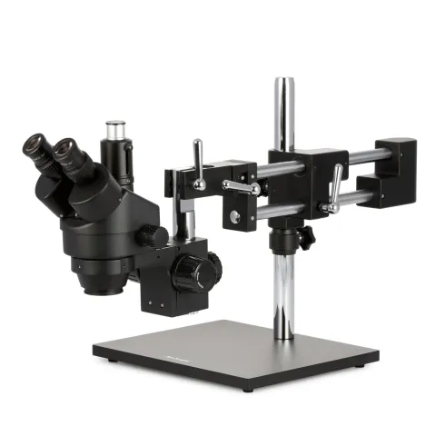 AmScope SM-4 Series Zoom Trinocular Stereo Microscope 7X-135X Magnification on Black Double Arm Boom Stand