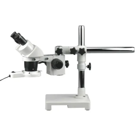 This binocular stereo microscope gives 10X and 30X magnification settings with sharp clear images and high resolution. It comes with super widefield and high-eyepoint eyepieces, a single arm boom stand and a fluorescent ring light. It offers large working distance and versatility. It is an ideal instrument for research labs, gemologists, collectors, engravers, and anyone in semiconductor or electronic industry.