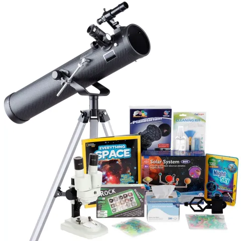 - This Moon Gazer set includes a 15-150x compact telescope, Build & Paint Solar System kit, smartphone mount for taking pictures, 140 pack of glow-in-the-dark adhesive stars, 3-in-1 professional cleaning kit, and 280 count cleaning wipes.