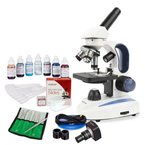 AmScope VB-M158C-2L-EXPT Value Bundle Cordless Metal Frame Monocular Compound Microscope 40X-1000X Magnification w/ LED, Course and Fine Focus, 5MP Camera and Vital Stain Kit