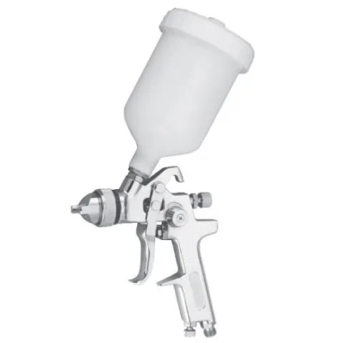 - Gravity feed action lets fluid flow downward using less air and offering better control over atomization and fluid output