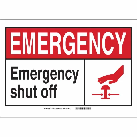 Brady 119841 10 in H x 14 in W Black, Red, White Aluminum Sign "Emergency Emergency Shut Off"