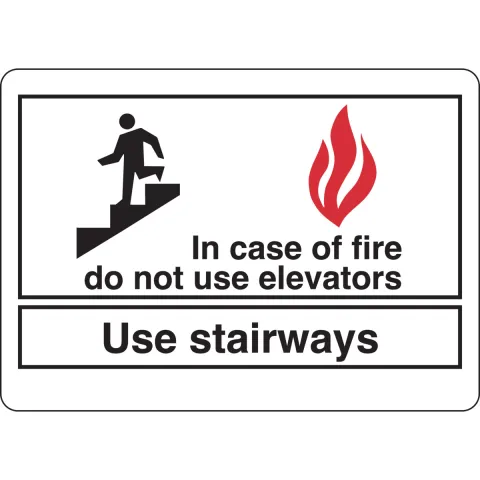 Brady 122341 10 in H x 14 in W Black, Red on White Aluminum Sign "In Case Of Fire Do Not Use Elevators Use Stairways"