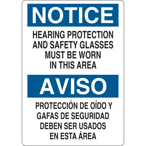 Brady 124031 Sign "Bilingual Notice Hearing Protection and Safety Glasses Must Be Worn in This Area" B-555 Aluminum 10"x7"