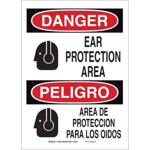 Brady 124086 Sign "Bilingual Danger Ear Protection Area" B-401 Polystyrene 10"x7" Black Red on White
