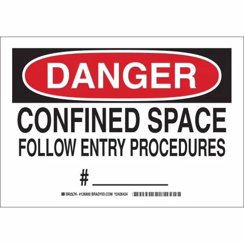 Brady 126801 "Danger Confined Space Follow Entry Procedures #__________" Sign Aluminum Black Red on White 10" x 14"