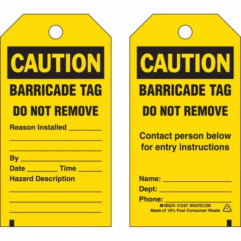 Brady 132421 "Caution Barricade Tag Do Not Remove" Accident Prevention Tags Polyester Black on Yellow 5.75" x 3"