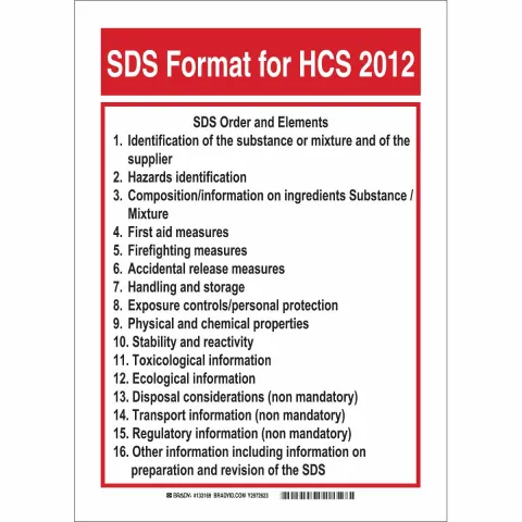 Brady 133172 "SDS Format for HCS 2012" Sign Polyester with Polyester Overlaminate Black Red on White 14" x 10"