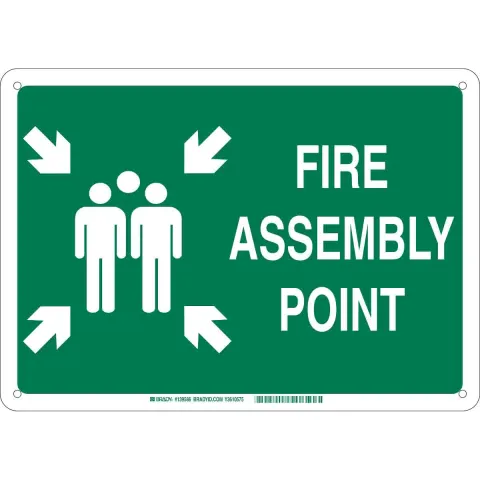 Brady 139586 10 in H x 14 in W Green on White Fiberglass Sign "Fire Assembly Point", with Pictogram