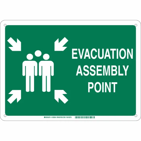 Brady 139610 10 in H x 14 in W Green on White Aluminum Sign "Evacuation Assembly Point", with Pictogram