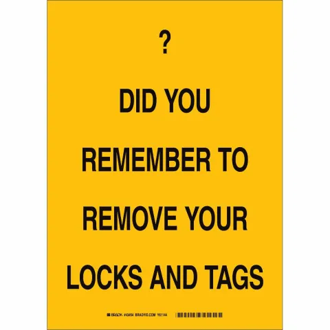 Brady 25877 14 in H x 10 in W Black on Yellow Polystyrene Sign "Did You Remember to Remove Your Locks and Tags"