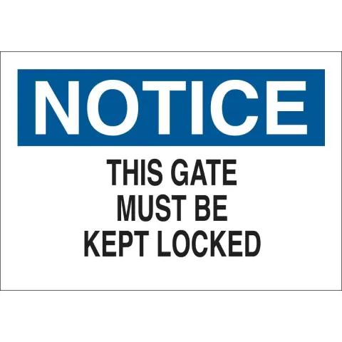 Brady 41108 10 in H x 14 in W Black, Blue on White Aluminum Sign "Notice This Gate Must Be Kept Locked"